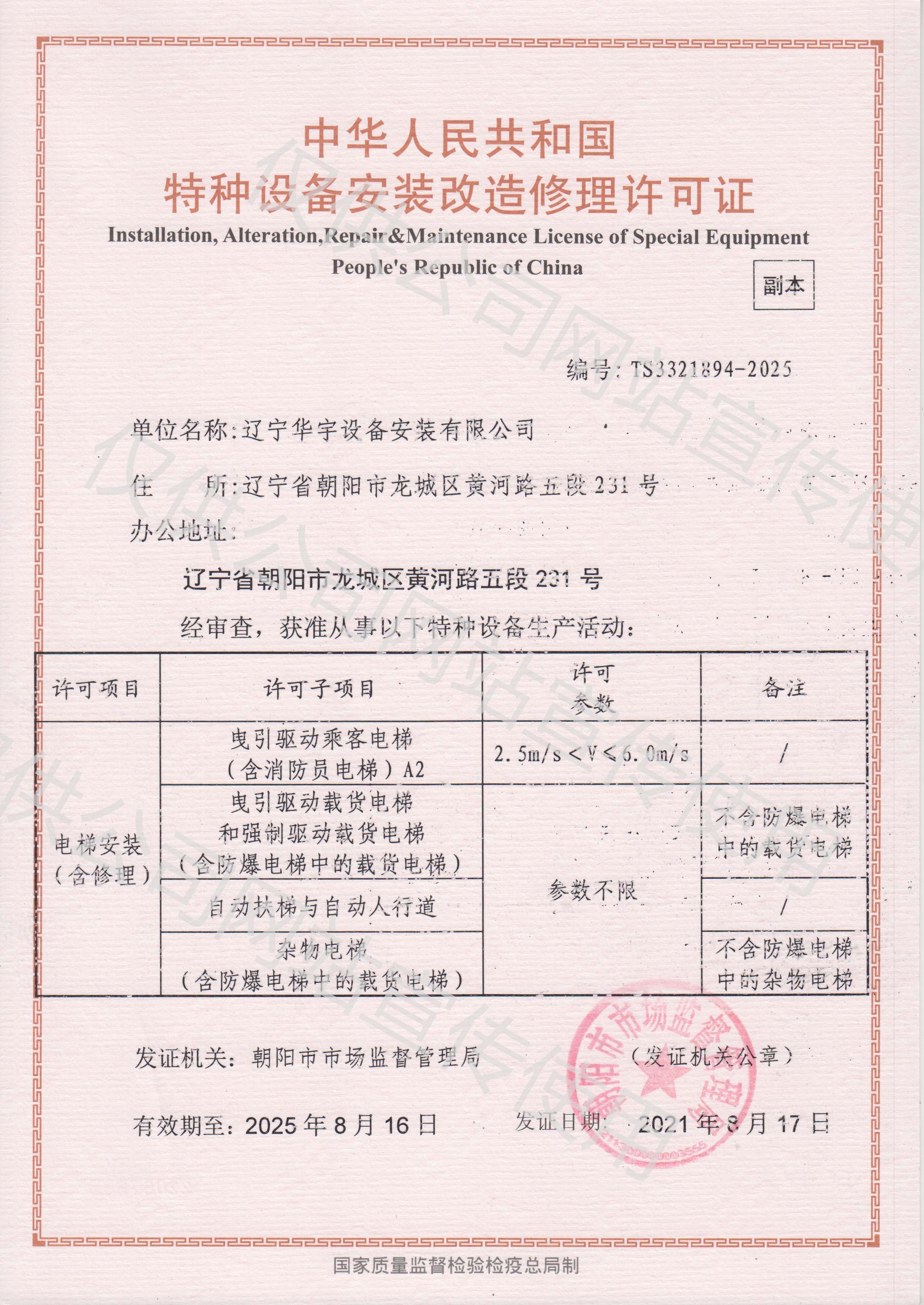 ? ? ? ?? 遼寧華宇設(shè)備安裝有限公司成立于2002年7月15日,注冊資金10000萬。公司占地面積60余畝,建筑面積4000余平。現(xiàn)取得消防設(shè)施工程專業(yè)承包一級資質(zhì)、消防設(shè)施維護保養(yǎng)檢測一級資質(zhì)、建筑機電安裝工程專業(yè)承包一級資質(zhì)、電子與智能化專業(yè)承包二級、建筑裝修裝飾工程專業(yè)承包二級、安全技術(shù)防范設(shè)施設(shè)計施工二級資質(zhì)、建筑工程施工總承包三級、電力工程施工總承包二級、輸變電工程專業(yè)承包二級資質(zhì)、電力承裝、承修、承試三級資質(zhì)、鋼結(jié)構(gòu)工程專業(yè)承包三級資質(zhì)和地基基礎(chǔ)工程專業(yè)承包三級。同時是人防工程通風(fēng)(防化)設(shè)備生產(chǎn)安裝企業(yè),并具備電梯銷售、電梯安